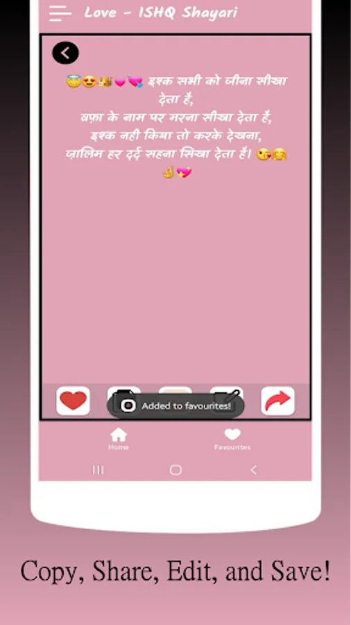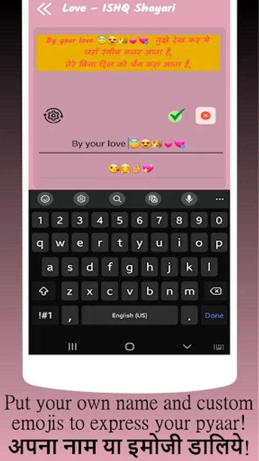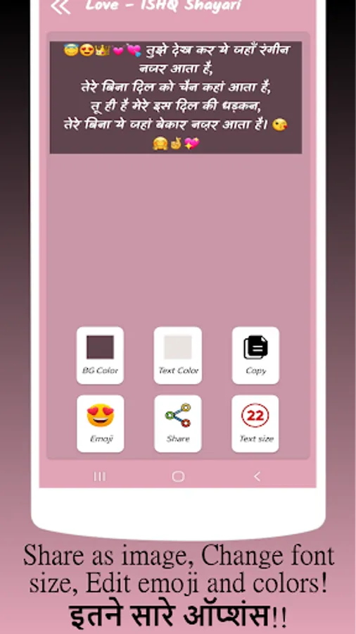Now you can Share the shayari as an image through Whatsapp, Instagram, Facebook, or other social apps! You can also add your name or custom emojis to the shayari! Also have the option to change the background color, text color, and font size!! So many options!!