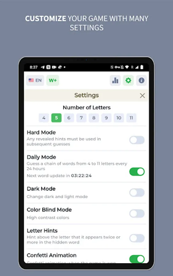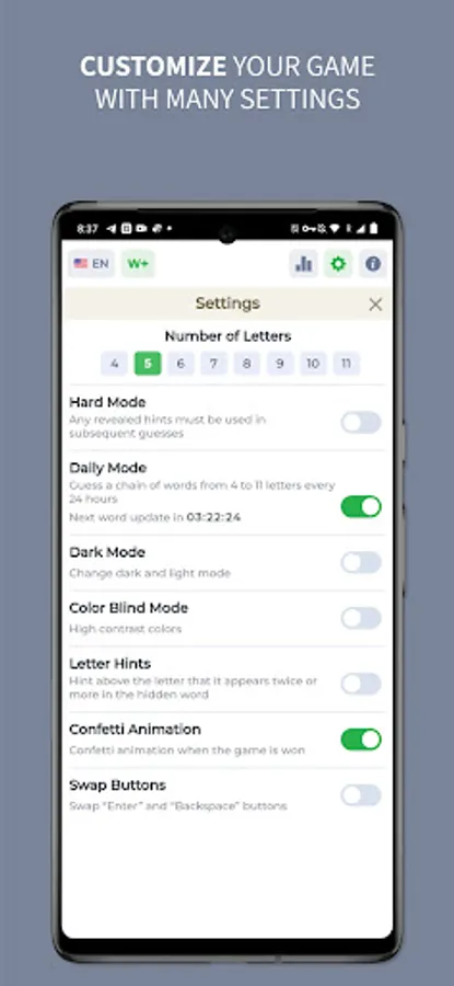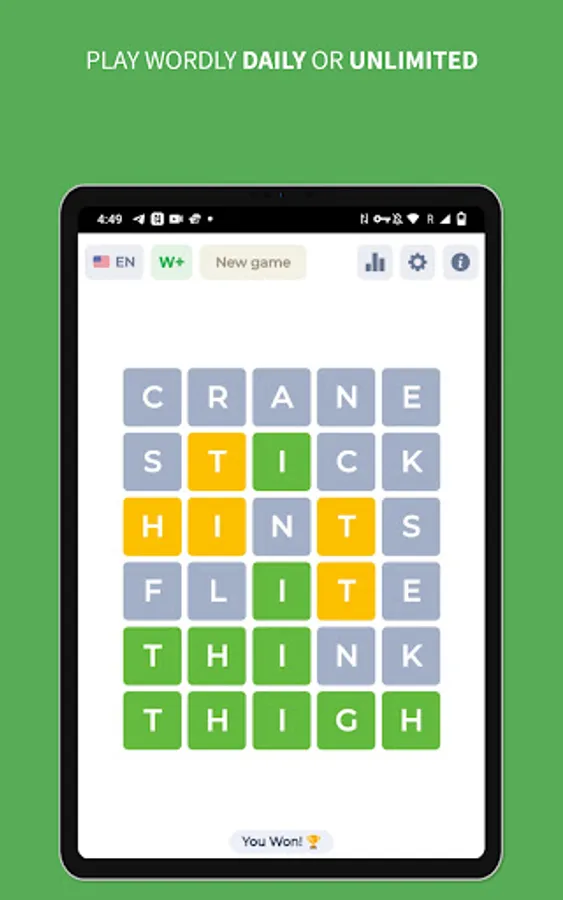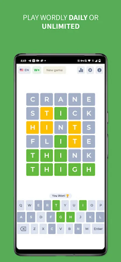 Do you like Wordle? Now this simple and fun word game is in your pocket. Come back every day for a new challenge, or play your own puzzles as many times as you like.