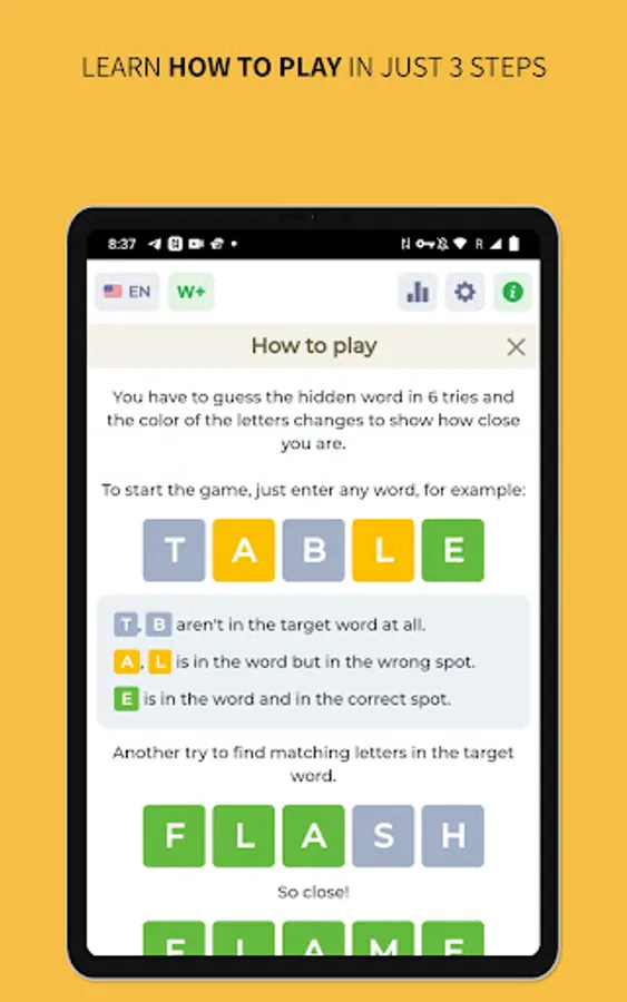 Wordle rules are very simple: You have to guess the hidden word in 6 tries. To get started, just type any word on the first line. If the letter is guessed correctly and is in the correct place, it will be highlighted in green color, if the letter is in the word, but in the wrong place - in yellow color, and if the letter is not in the word, it will remain grey.