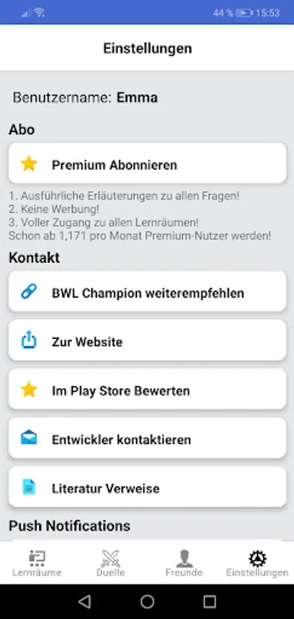 If you choose to subscribe to a BWL Champion subscription, your account will be billed and billed for renewal in the 24-hours prior to the end of the current subscription. You can stop auto-renewal at any time in the App Store settings. The current price for the BWL Champion subscription is €2/month (12 months) or €3.33/month (3 months). In the case of the monthly cancelable subscription variant, the usage fee is €6.99/month. Prices are in EUR, may differ in other countries and are subject to change without notice. If you decide against the premium version, you can continue to use Business Champion for free.
