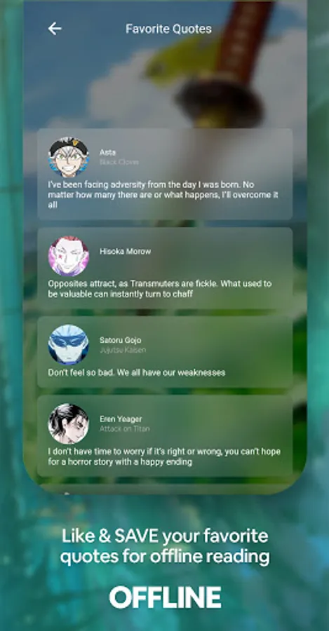 This app is primarily for entertainment purposes, and it is made by anime fans for anime fans to enjoy the Anime legacy. All the quotes and characters belong to their respective authors and publishers of the series