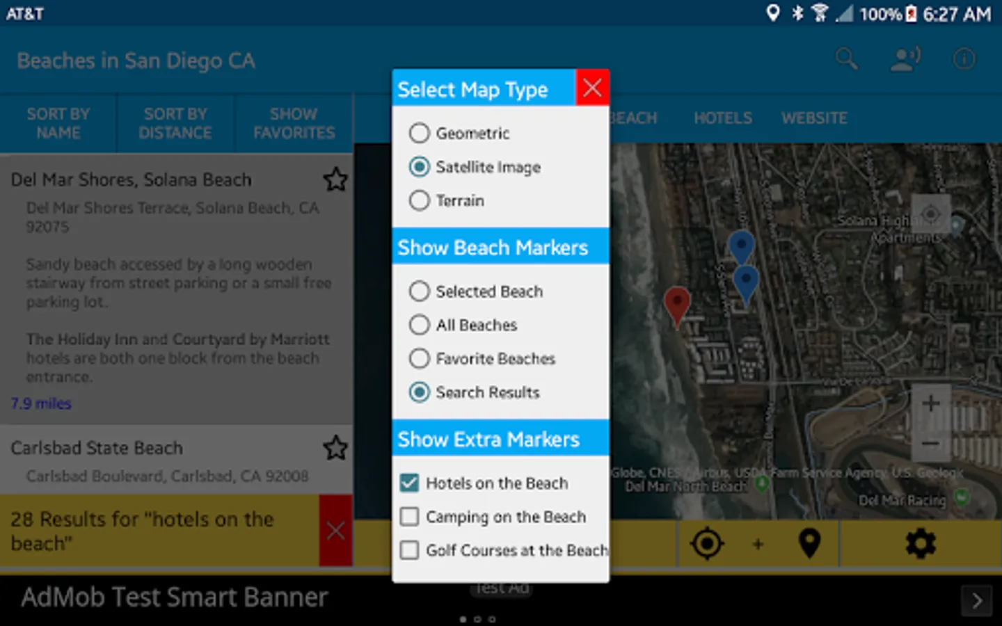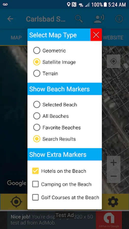• Show marker types - Use map settings to select which markers to display (just the beach selected from the list, all beaches, favorites or search results)