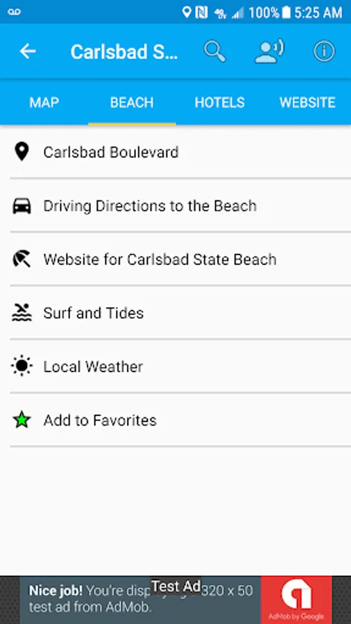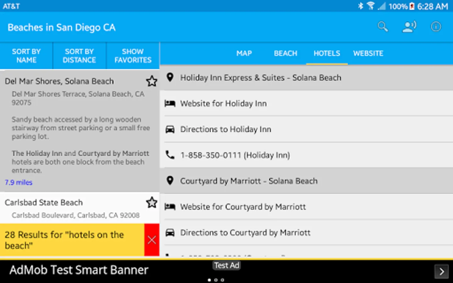 • List of beaches with street addresses, distance to your location and descriptions (including nearby hotels, campgrounds and golf courses)
