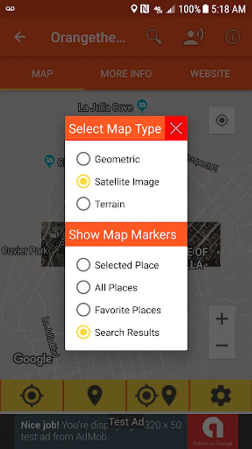 • Change map type - Use map settings to show geometric (normal) view, satellite image view (useful for finding parking lots and buildings) and terrain view