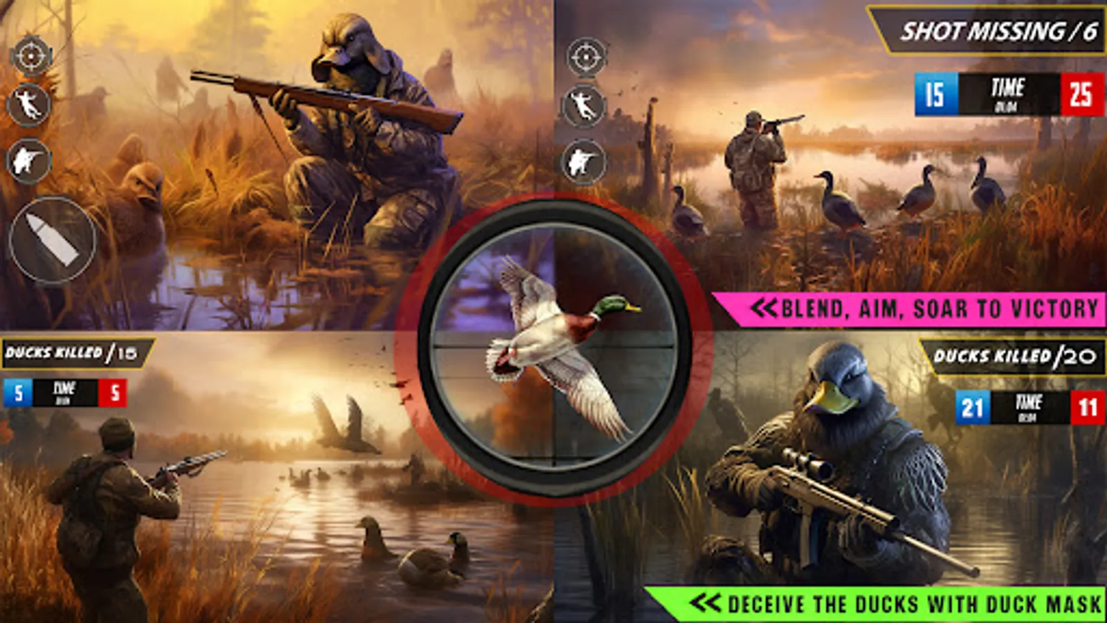 Take guidance from pro shooter in duck hunting training mode to prepare yourself for further challenges. Do not miss the chance to get this birds hunting game with exclusive experience of wild duck shooting games.