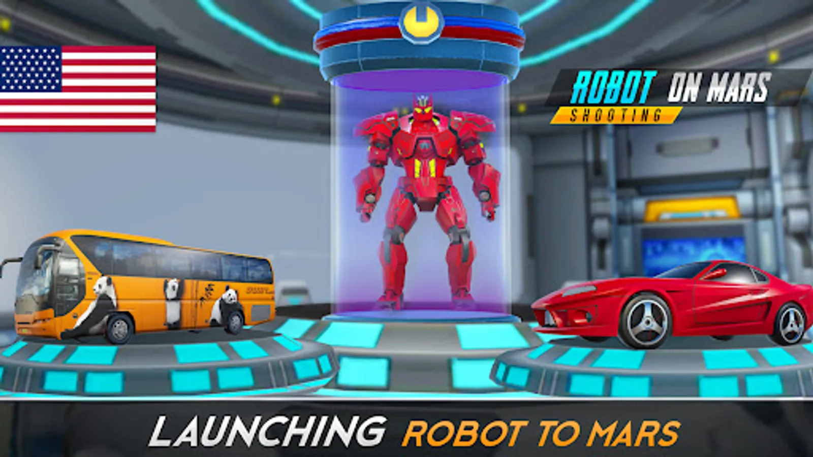 Build your own multi transforming robots and transport them to the planet Mars. Transform yourself into bus robots and car robots and launch them into space station. Driving through the ramps and robots teleport scene from earth planet to Mars provides a thrilling scenario in bus robot games and robot car games 3d. On planet mars, launch your war robots for final mars robot battle in bus robot games and car robot games.