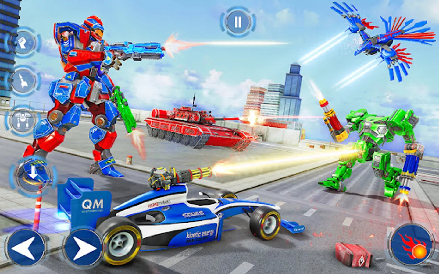 This tank robot game with the combination of eagle robot game has many newest modes and missions to add excitement in the game play. Huge variety of Mech war robots are there to choose from. Play with your favourite robot transform and land into the battle of unending clashes. The time is yours go ahead achieve every milestone required to become the top player of flying eagle robot games and police car robot games 2023. Tank robot car war game that encapsulates eagle robot transform battle and car robot wars within; demands extreme robot fighting skills and attention of the player.