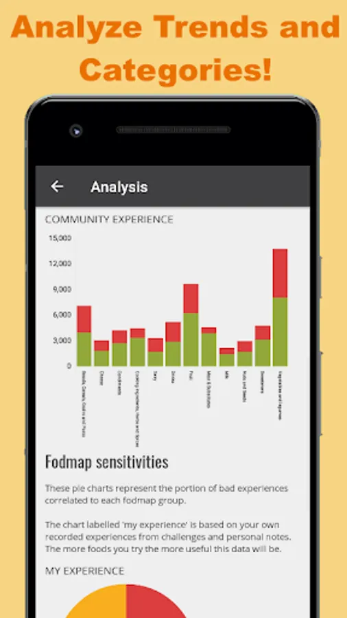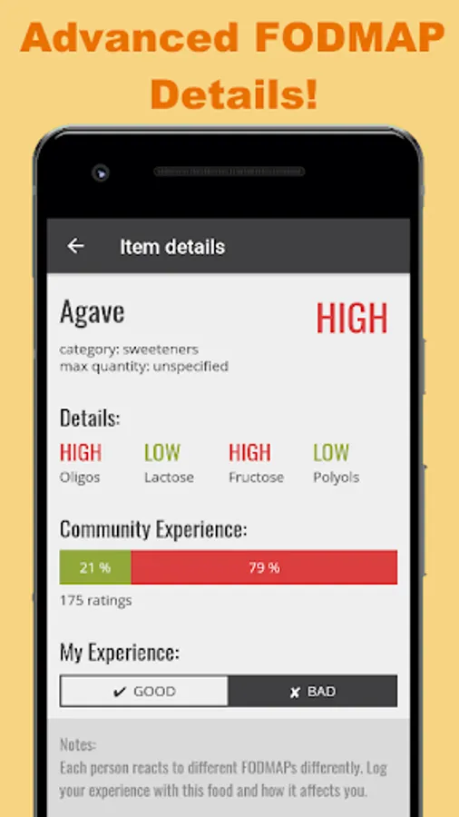 Community Experience - See how the community has reacted to a food via anonymized My Experience ratings. This will let you know if the majority of users of the app had a good or bad reaction to a food.
