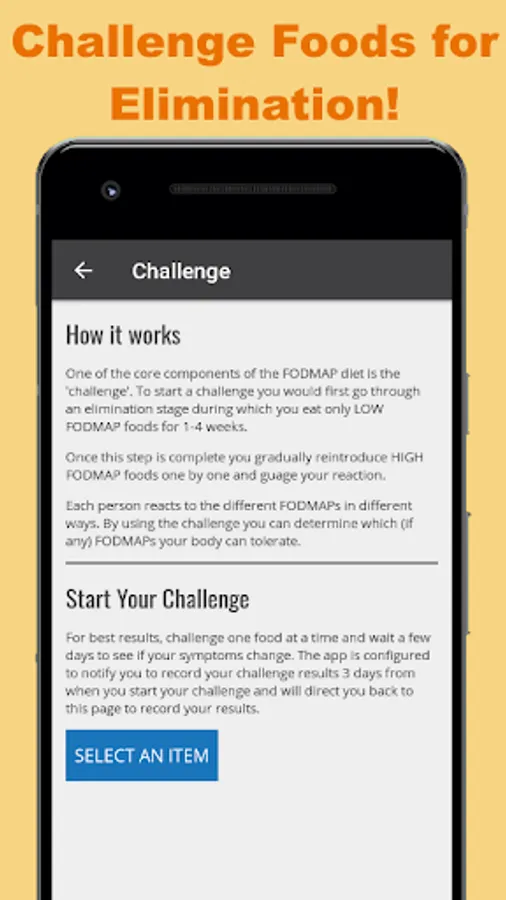 Challenge - The FODMAP Diet is an elimination diet for IBS, GI diseases, and food sensitivities. Once you've eliminated all high FODMAP foods from your diet, you can challenge foods to determine if they work for you. This lets you introduce these foods back into your regular meals one at a time and track your experience with each food after three days to determine if it will work in your FODMAP friendly diet. More details on challenges are contained within the app.