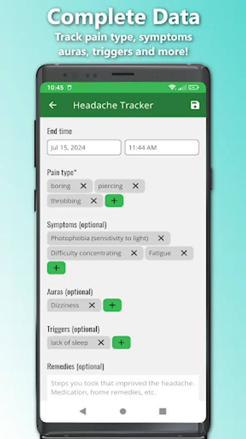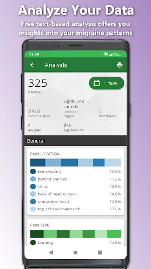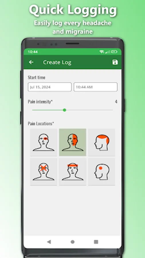 - Easy Logging: Record headache details like duration, severity, pain location, pain type, and triggers.