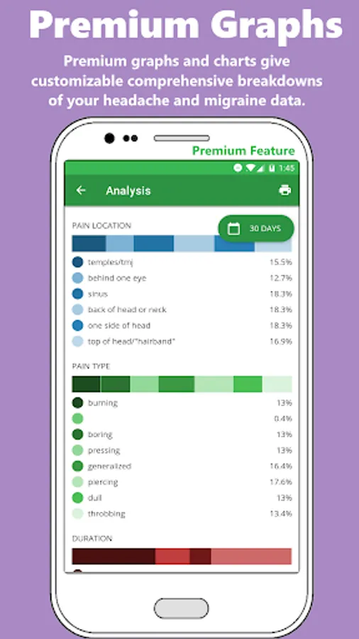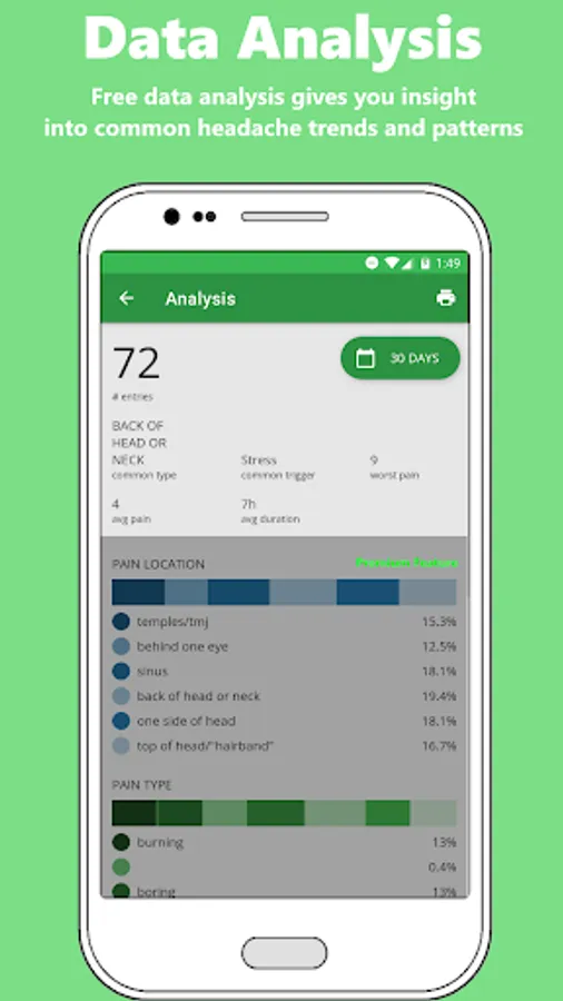 - Premium Features: Advanced analysis, detailed graphs, and medication tracking to correlate medication use with headache patterns.