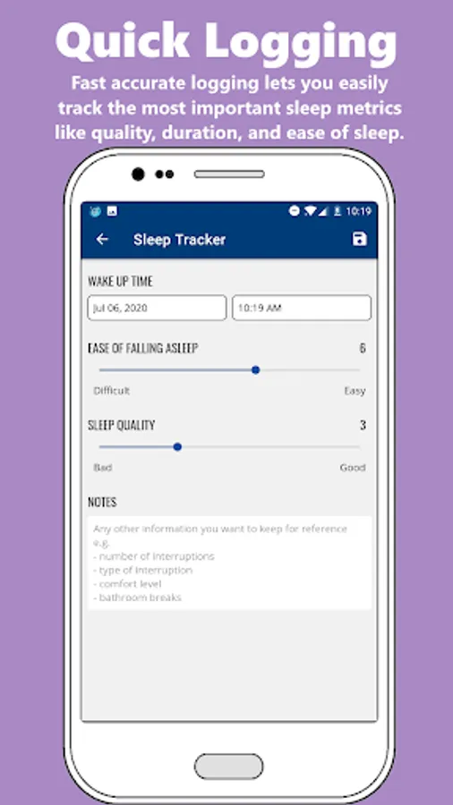 - Log the bed time and wake-up time, sleep quality, and ease of falling asleep, of your regular sleep sessions.
