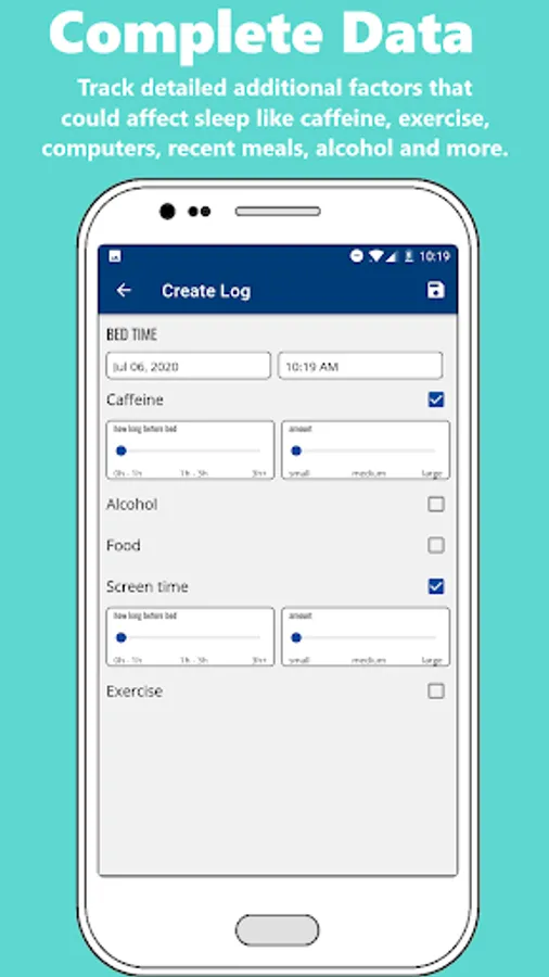 - Track other factors that may affect your sleep habits or cause insomnia such as Caffeine, Alcohol, Exercise, Computer screens and meals.