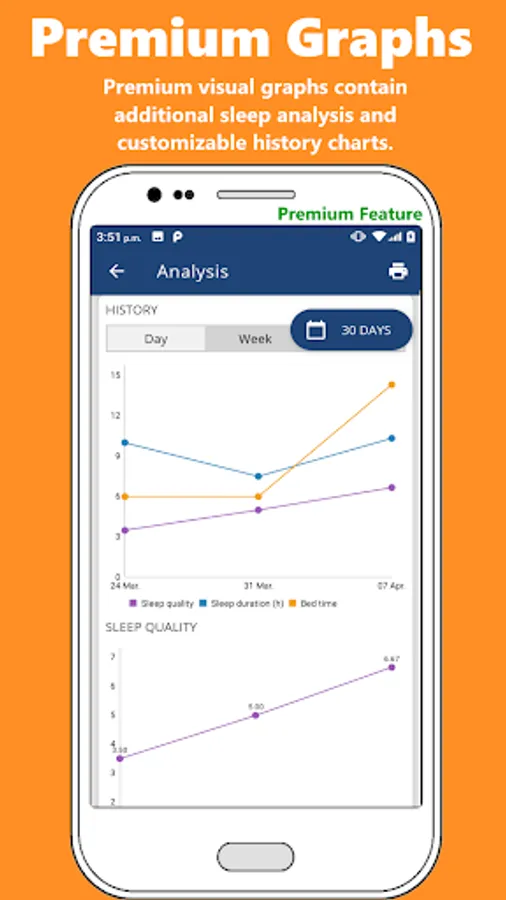 - Premium Visual Analysis with detailed breakdowns of bedtime, sleep quality and duration by day of week, and comprehensive sleep history.