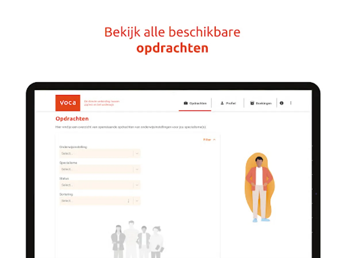 Voca Education is the direct connection between freelancers and education. As an educational institution, you have the option of placing assignments, searching for freelancers and booking them directly. As a self-employed person, you manage your own profile, indicate when you are available, determine your own rate and negotiate with the client(s) about the terms and conditions of the assignment.