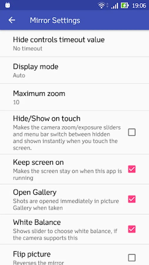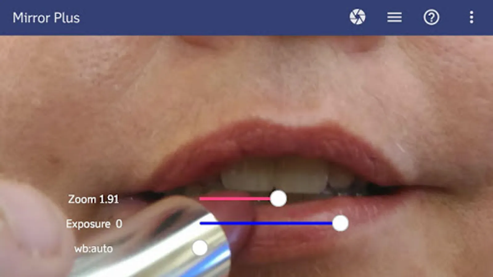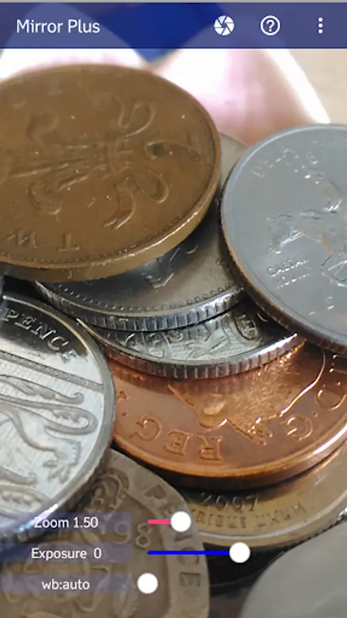 Mirror Plus has a smooth, fast zoom (up to a massive twenty times!), freeze (pause) picture, and white balance and brightness adjustment sliders