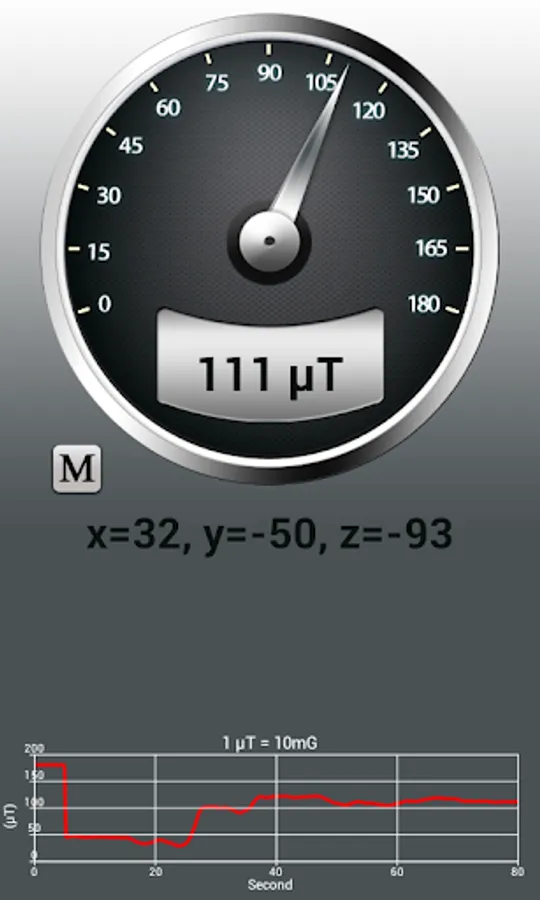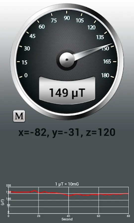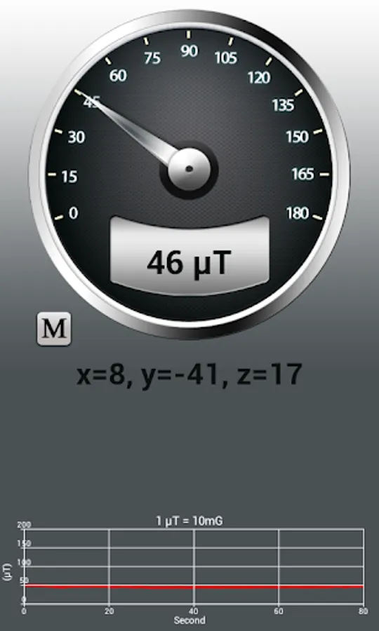 This app measures magnetic field values using the magnetic sensor that is built into the phone. The magnetic field level(EMF) in nature is about 49μT(microtesla) or 490mG(milligauss). 1μT = 10mG.