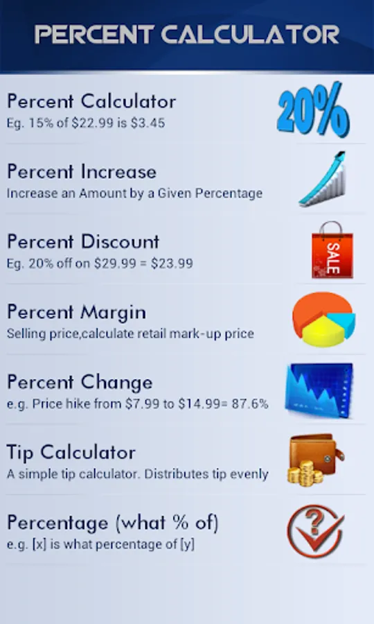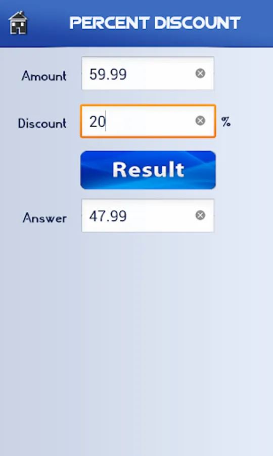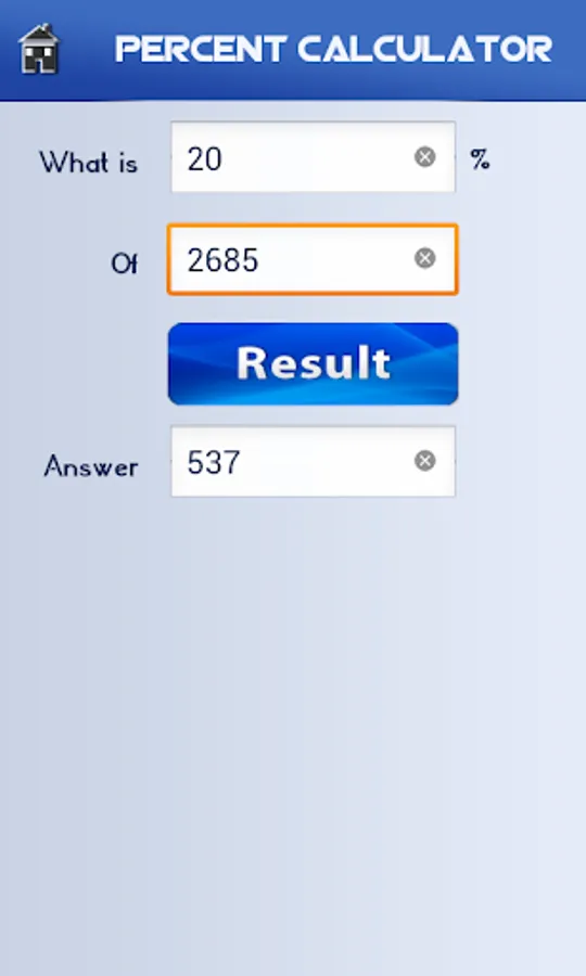 Enter any two values and the third is computed e.g. [23]% of [x] = 115. X will be computed (20).