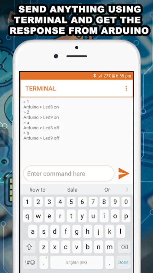 Run the app, search for your bluetooth module and connect. Once you are connected you will be able to send your own commands to your Arduino board using the keyboard or some fancy buttons