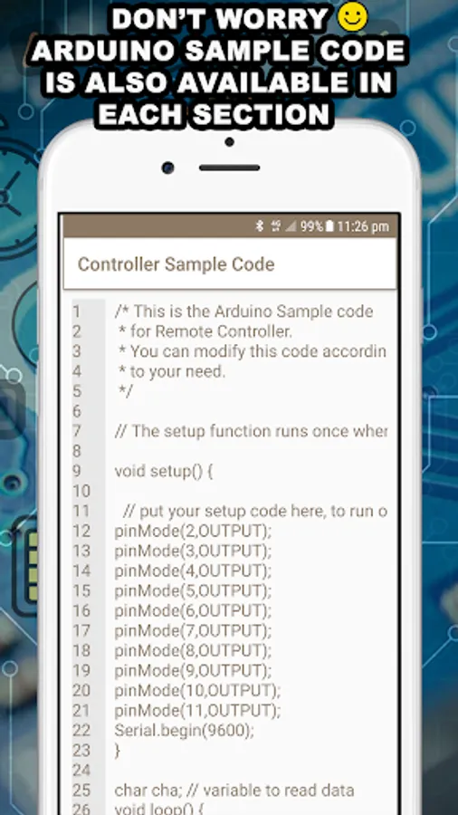 -> ARDUINO SAMPLE CODE: The Arduino SAMPLE code in C++ is provided in each feature/section of the app so don't have to worry about the code at all. You can find it in the Menu easily.