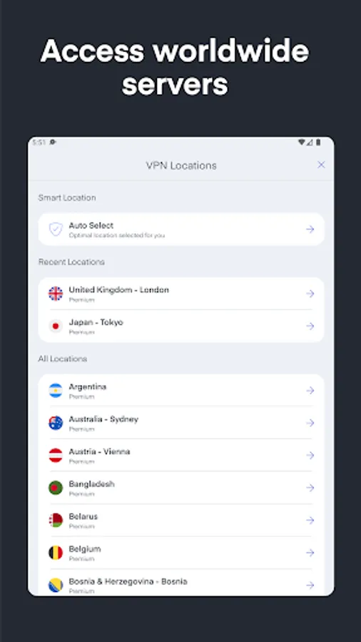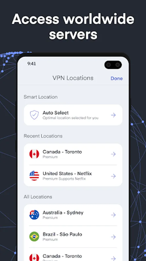 Connect via VPN Proxy client app to servers around the world. Servers are located in the US, UK, Canada, Australia, India, France, South Korea and many other countries around the world.