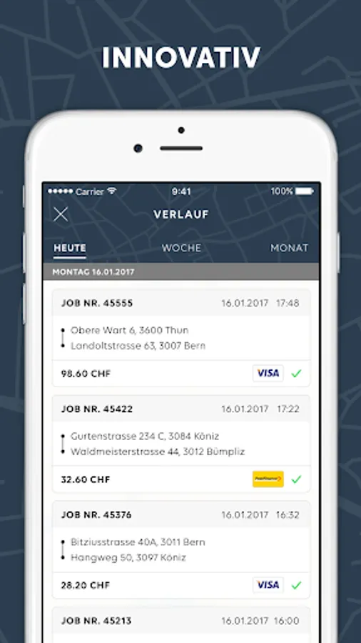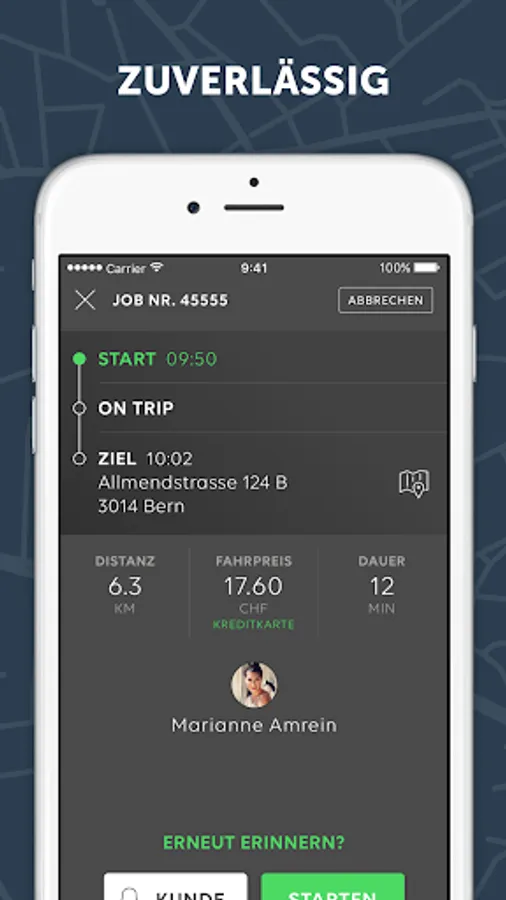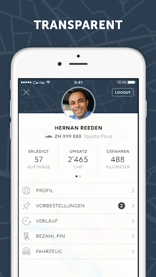 The go! Driver app allows licensed taxi drivers access to prepaid fixed price journeys throughout Switzerland. To use the Driver app to an agreement with go needs! be taken and signed.