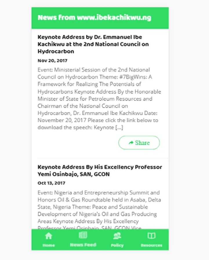 This mobile app brings regular content directly from his official website : http://www.ibekachikwu.ng to anyone interested in authentic news, information about this outstanding Honourable Minister of the Federal Republic of Nigeria using the public api of his official website.