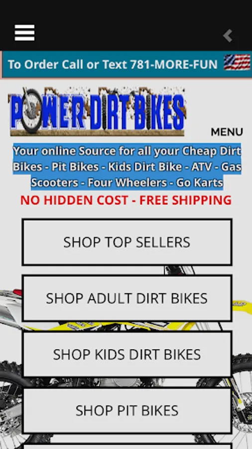 We're very excited to now be in the app store! Our Power Dirt Bikes app has been designed with you in mind - focusing on giving you a better user experience. It allows you to easily order dirt bikes, pit bikes, four wheelers, gas scooters, motorcycles, utv and more for sale and stay up to date with everything we've got going on, communicate with us at the touch of a finger, and even receive notifications from us for all the latest happenings. Download us now and check out our brand new application today! Https://www.powerdirtbikes.com
