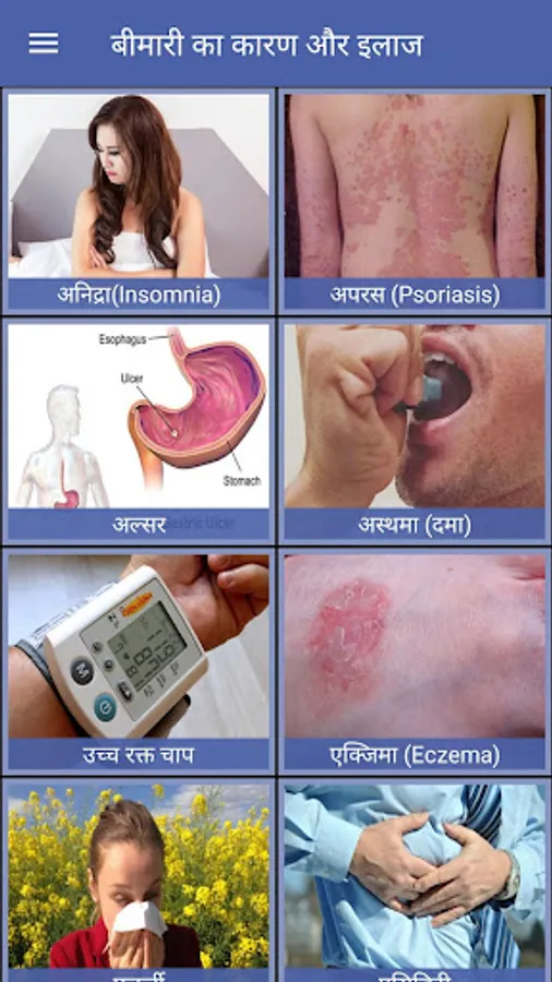 अनिद्रा(Insomnia), अल्सर, अस्थमा (दमा), उच्च रक्त चाप, एक्जिमा (Eczema), एलर्जी, एसिडिटी, कब्ज (Constipation), कान के रोग (Ear Diseases), कैंसर (Cancer), क्षय रोग (टी.बी.), खुजली (Eczema), गठिया रोग, गलसुआ, घमौरियां (Prickly Heat), चक्कर आना, चर्म रोग (Skin Disease), चेचक (Chicken pox), डेंगू बुखार, थायरायड, थैलेसीमिया, पायरिया, पित्त का रोग (Bile disorder), पीठ दर्द, पीलिया, पैरो में सुजन, प्लूरिसी (Pleurisy), फ्रैक्च्र और दर्द, बद्ध कशेरुका, एंकायलूजि़ग स्पांीडेलाइटिस (Ankylosing Spondylitis), बुखार, बेहोशी, मधुमेह (Diabetes), मलेरिया, माइग्रेन, मूत्र विकार, रयूमेटायड आर्थराइटिस, लकवा (Paralysis), लू लगना (Sun stroking), सफेद दाग (Leucoderma), साईटिका (गृधसी), सोरायसिस (Psoriasis), स्वाइन फ्लू, हड्डी का टूटना (Bone fracture), हृदय रोग आदि कुछ रोग हैं, जो बहुधा नागरिकों को परेशान करते हैं। इन बीमारियों का उचित और कई का लंबे समय तक इलाज करने की जरुरत पड़ती है।