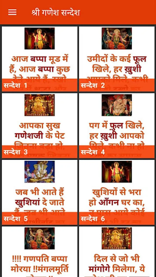 श्री गणेश को शुभ शुरुआत, समृद्धि और बाधा हटाने के देवता के रूप में माना जाता है। इसलिए इनके सन्देश अपने मित्रो और परिजनों को भेजकर अपने दिन की शुरुआत करे। और इसके लिए आपको सभी सन्देश पढ़ना होगा और यदि आप किसी सन्देश को पसंद करेंगे तो आप सीधे सोशल मीडिया ऐप के माध्यम से अपने मित्रो के साथ साझा कर सकते हैं।