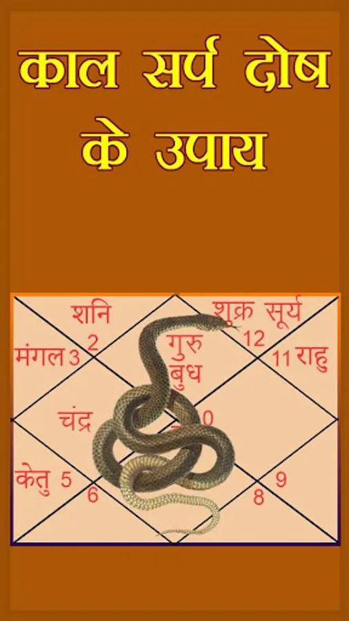Kalsarp yog is formed when all seven planets are come between Rahu and Ketu. A complete Kalsarp Yog is formed when exactly half the natal chart is unoccupied by planets. Exclusion of even one single planet outside the Rahu-Ketu Axis does not signify Kalsarp Yog. An individual taking birth in this Kaalsarpyog suffers tensions, fear and insecurity, and has a constant fear from death. This yoga is considered to be more malefic than any other malefic yoga or dosha.