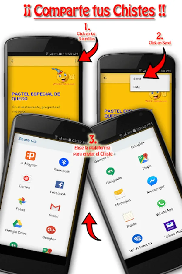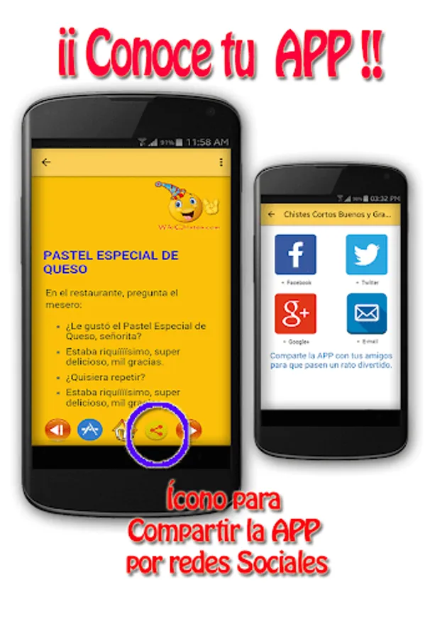 ★ También podrás compartirlos con tus amigos por redes sociales, correo electrónico y hasta usando bluetooth. No hay límite para compartirlos. Tus amigos te lo agradecerán… Son todos Chistes Graciosos!!!