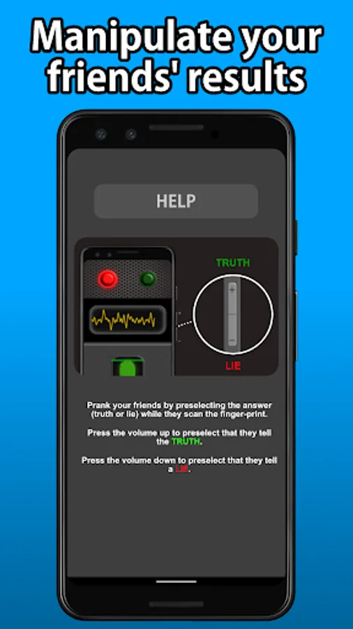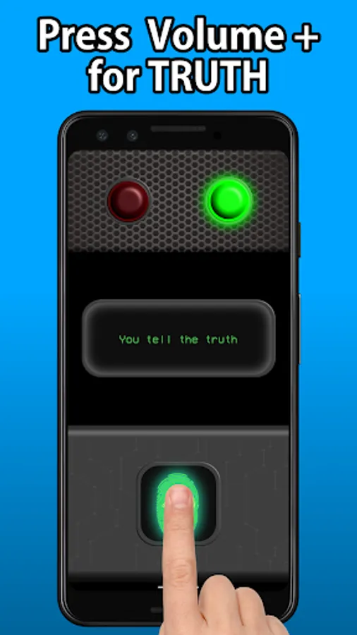Have fun with your friends and family playing a joke with this truth machine simulator. Press volume + or volume - to manipulate the result while having your finger on the fake fingerprint recognition. Manipulate with the polygraph simulator and embarrass your friends with true or false results at your convenience.