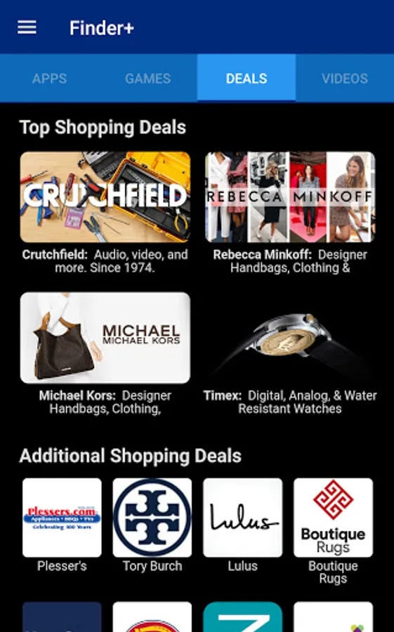The new Finder+ app (previously AppFinder) has been updated to provide more great content for you to discover. Continue to explore recommended apps and games, but now also discover shopping deals and videos within the new Finder+ app.