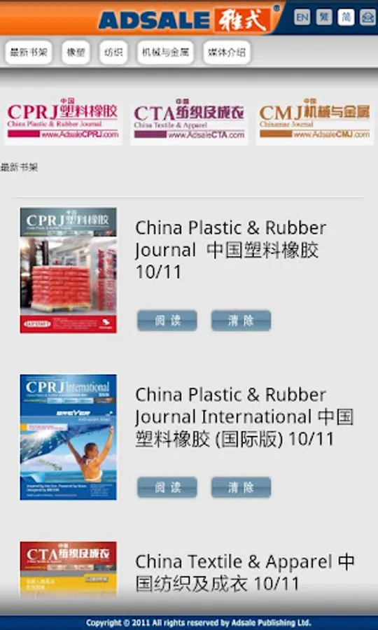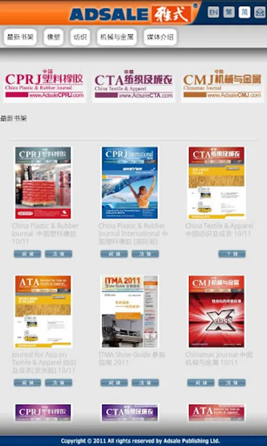 Adsale Pub APP brings you the entire CPRJ, CMJ, CTA & ATA library. Our journals provide readers with the latest market news, technology information and management insights of plastics, textile & apparel, machine tool and metalworking industries within and outside China. We also have wide coverage of international trade shows including CHINAPLAS, K Fair, ShanghaiTex, ITMA, CIMES, CIMT...etc.