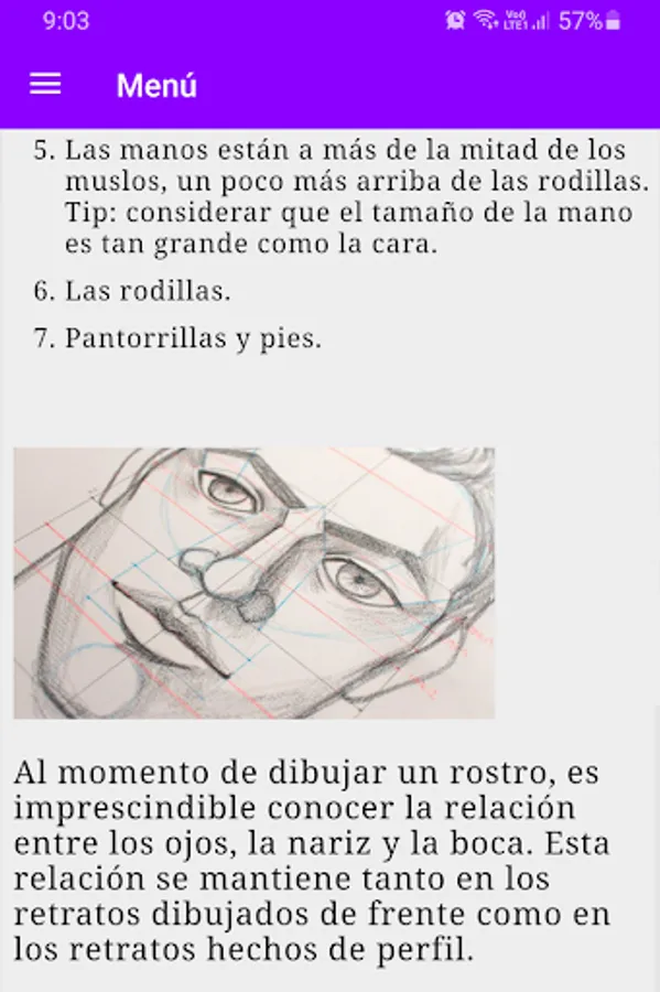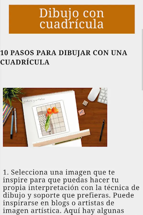 The app "Learn to draw step by step" brings you a manual completely in Spanish that contains the lessons you need to be a talented draftsman; each lesson is organized in an understandable and practical way. Follow the instructions to learn to draw and once you gain experience, use your imagination to create your own works, making fantastic drawings of faces, cartoons, landscapes or manga, following the principles explained here and perfecting your technique little by little.