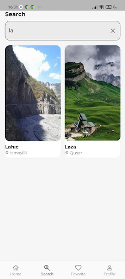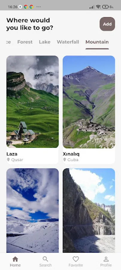 The first page of the application shows all the destinations divided into categories (place, forest, mountain, waterfall, etc.). By clicking on them, it is possible to see detailed information. You can also jump to the map by clicking the "Show on map" button. In the application, a dynamic search page is designed to easily find destinations. It is possible to register from the application using username/password, google and apple sign in methods. Registered users have the ability to favorite any destination and add a new destination. The application currently supports two language options (en, az). Various functionalities can be added to the program in the future. For example: writing reviews about destinations, loading guide information when entering the details of any destination, etc.
