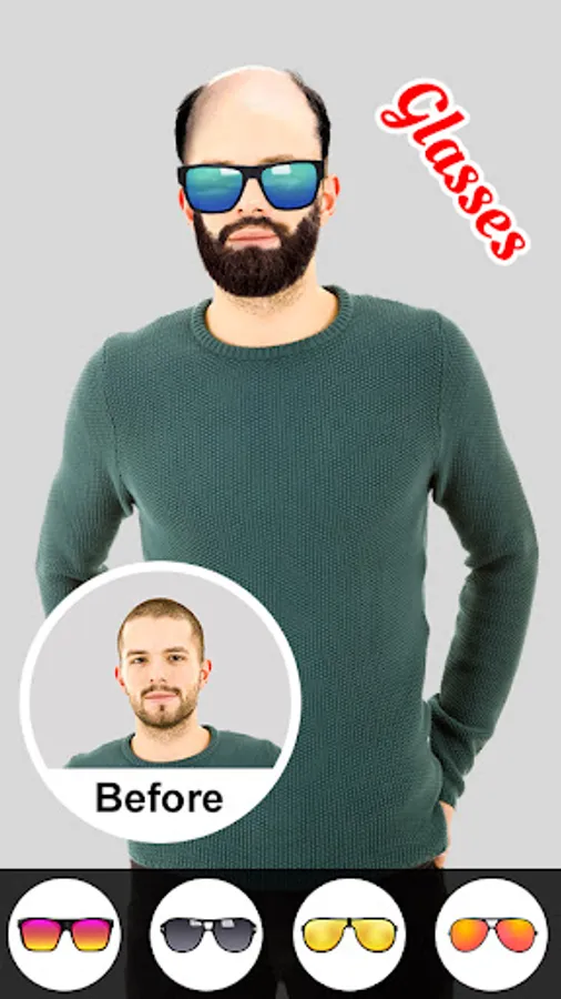 ➽ More than 150+ HD stickers of Bald photo editor Like Bald Style, Hair Style, Beard, Moustache Styles, Sunglasses, Turban and Caps.