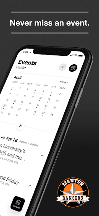 The event section shows a list of events throughout the district. Users can add an event to your calendar to share the event with friends and family with one tap.