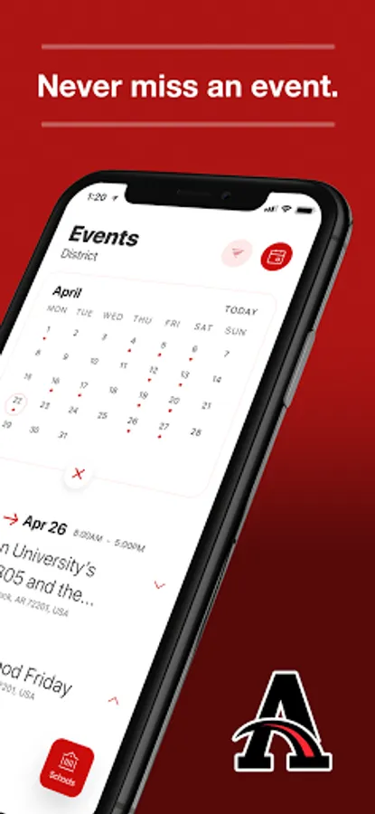 The event section shows a list of events throughout the district. Users can add an event to your calendar to share the event with friends and family with one tap.
