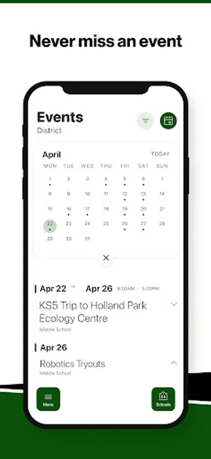 The event section shows a list of events throughout the district. Users can add an event to their calendar to share the event with friends and family with one tap.