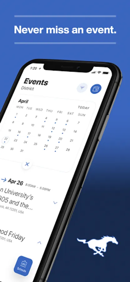 The event section shows a list of events throughout the district. Users can add an event to your calendar to share the event with friends and family with one tap.