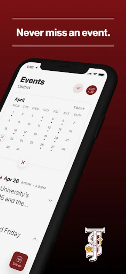 The event section shows a list of events throughout the district. Users can add an event to their calendar to share the event with friends and family with one tap.