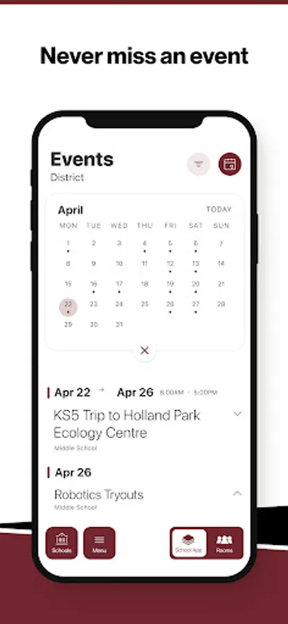 The event section shows a list of events throughout the district. Users can add an event to their calendar to share the event with friends and family with one tap.