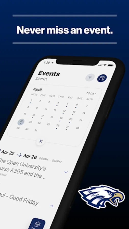 The event section shows a list of events throughout the district. Users can add an event to their calendar to share the event with friends and family with one tap.