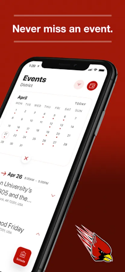 The event section shows a list of events throughout the district. Users can add an event to your calendar to share the event with friends and family with one tap.