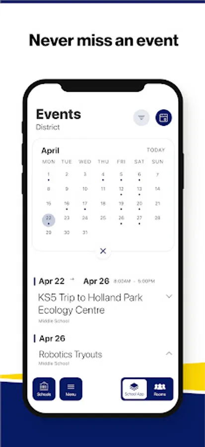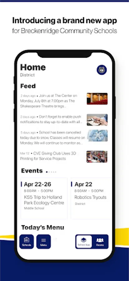 The event section shows a list of events throughout the district. Users can add an event to your calendar to share the event with friends and family with one tap.