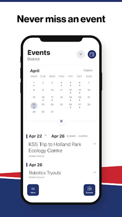 The event section shows a list of events throughout the district. Users can add an event to your calendar to share the event with friends and family with one tap.