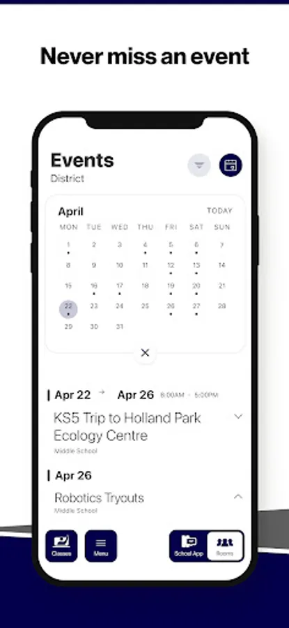 The event section shows a list of events throughout the district. Users can add an event to their calendar to share the event with friends and family with one tap.