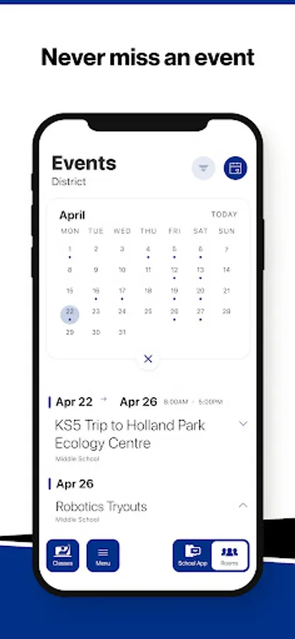The event section shows a list of events throughout the district. Users can add an event to your calendar to share the event with friends and family with one tap.